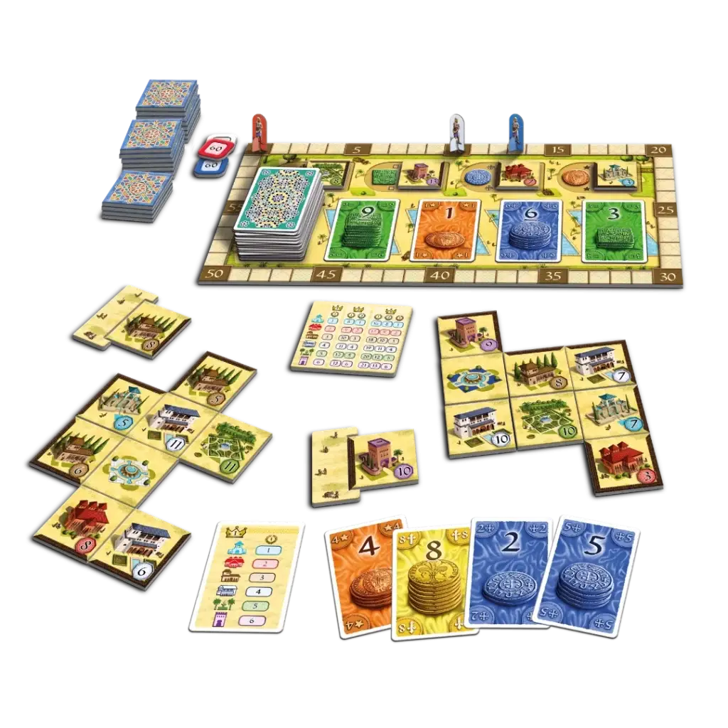 Scoring happens throughout the game, rewarding players who collect the most buildings of each type and those who construct the longest continuous outer wall. When the building supply runs out, a final scoring decides who has created the most magnificent Alhambra.