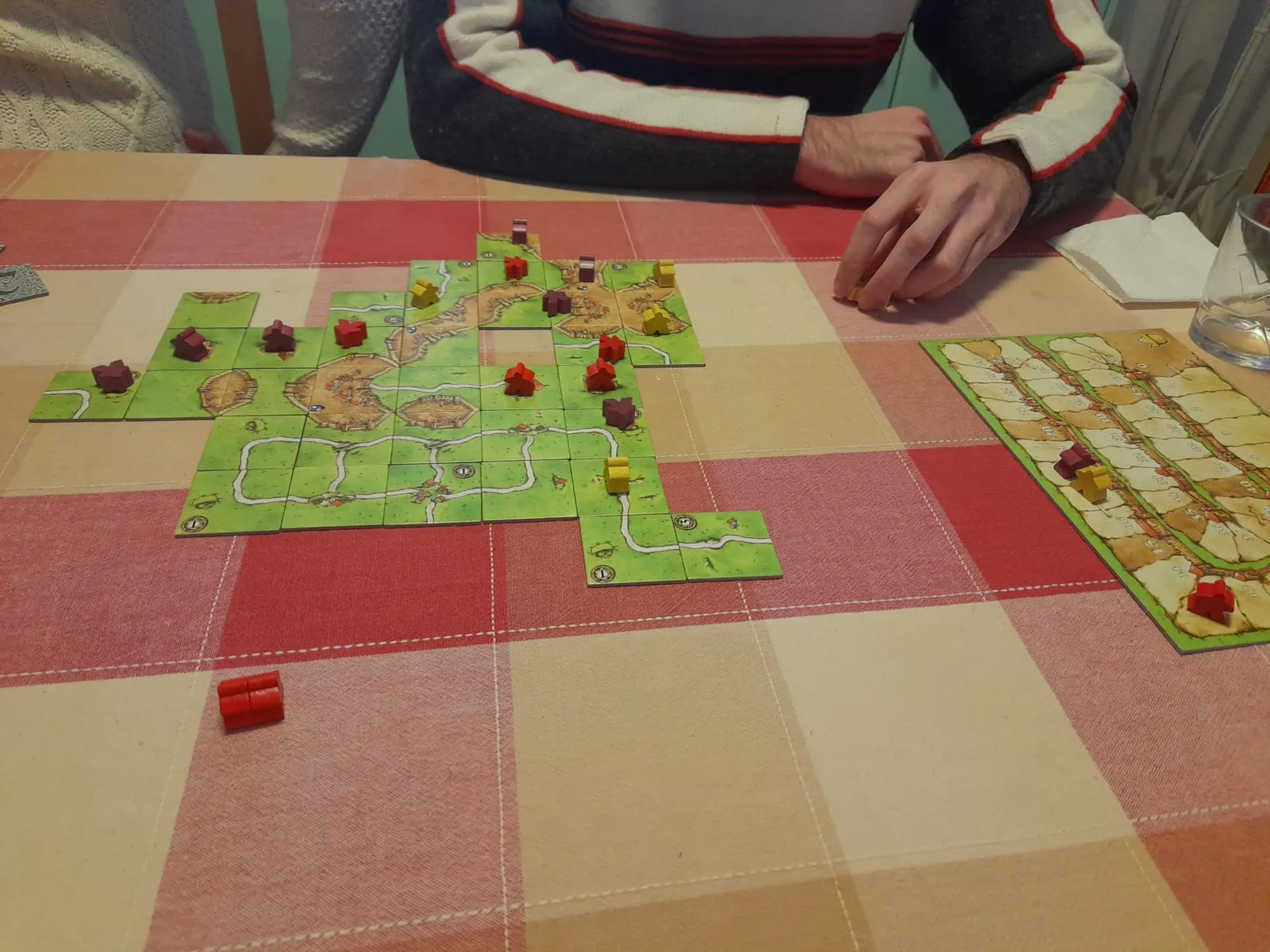 Carcassonne is a tile placement game in which the players draw and place a tile with a piece of southern French landscape represented on it. The tile might feature a city, a road, a cloister, grassland or some combination thereof, and it must be placed adjacent to tiles that have already been played, in such a way that cities are connected to cities, roads to roads, et cetera. Having placed a tile, the player can then decide to place one of their meeples in one of the areas on it: in the city as a knight, on the road as a robber, in the cloister as a monk, or in the field as a farmer. When that area is complete that meeple scores points for its owner.