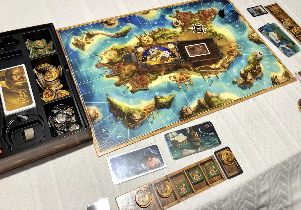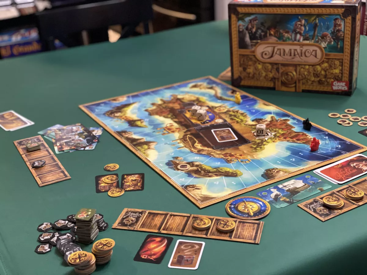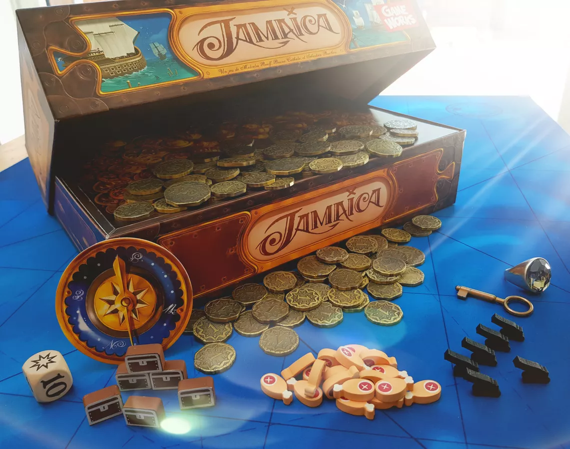 Goal: The game ends on the turn when at least one player’s ship reaches the finish line, completing one circuit around the island of Jamaica. At that point, players are awarded different amounts of gold in accordance with how far away from the finish line they were when the race concluded. This gold is added to any gold a player gathered along the way by detouring from the race to search for valuable treasure, by stealing gold or treasure from other players, or just by loading gold as directed by the cards the player played during the race. The player with the most total gold acquired through all these means is then declared the winner.