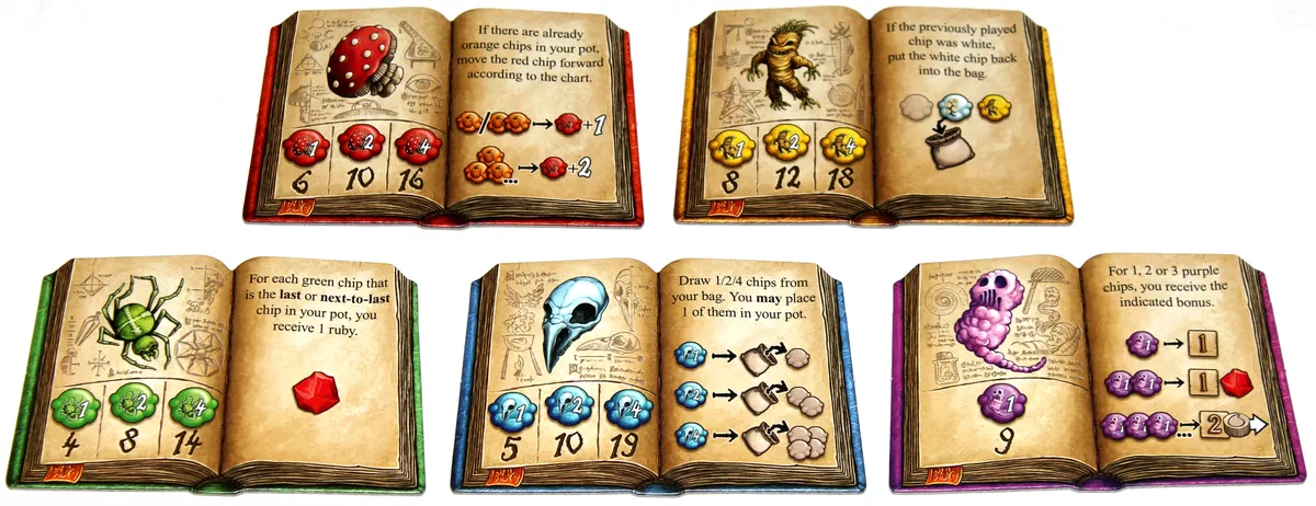 Every player has a personal bag filled with ingredient chips. During each round, everyone simultaneously draws chips and adds them to their pots. The higher the value on a chip, the farther it advances along the swirling pattern in the pot, increasing the potion’s overall worth. Push your luck as much as you dare—but beware! Too many cherry bombs will cause your pot to explode.